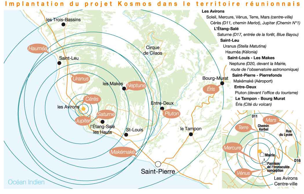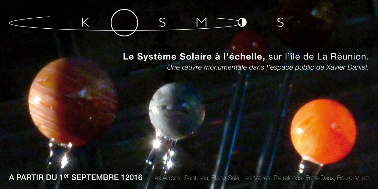 Kosmos de Xavier DANIEL Il s’agit de la maquette à l’échelle de notre système solaire créée et installée en divers endroits de l’île de la Réunion par l’artiste réunionnais Xavier DANIEL.