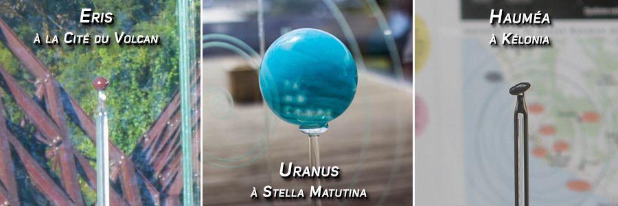 Dans cette maquette, à une échelle de 1/555 000 000, le diamètre du Soleil est de 2,5 mètres. La Terre, d’un diamètre de 2 cm est placée à 270 m du Soleil. La géante Jupiter, d’un diamètre de 20 cm, se trouve à 1,4 km du Soleil. La planète naine Pluton, est installée à 13 km du Soleil, tandis que Ceres est à 26 km.