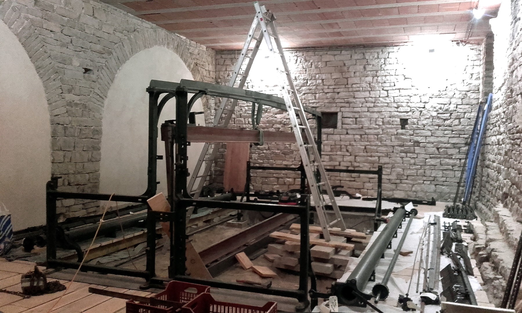 Nous sommes au sous-sol du musée Charles Portal, sur les fondations des maisons des premiers Cordais du 13ème siècle. Deux semelles en béton sont « posées » sur le sol, ainsi que des petits plots pour les stabilisateurs.