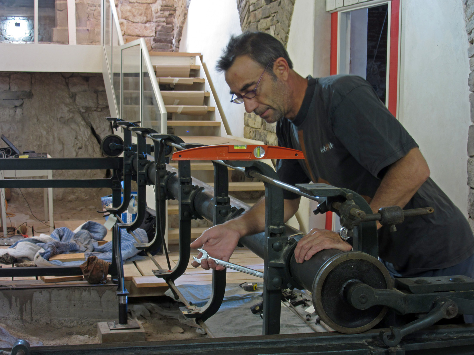 Une fois en place, c’est du réglage. Un démonte-pneu en guise de levier, un régal. Avec sensibilité et douceur, on aide les pièces à bien prendre leur place. Il faut à peine forcer pour bouger, juste les prendre dans le bon sens. Desserrer certains boulons, les resserrer, en desserrer d’autre, mobiliser progressivement les parties de la machine. Une goutte de lubrifiant, des mouvements de va-et-vient, observer, régler les butées, écouter leur son, les