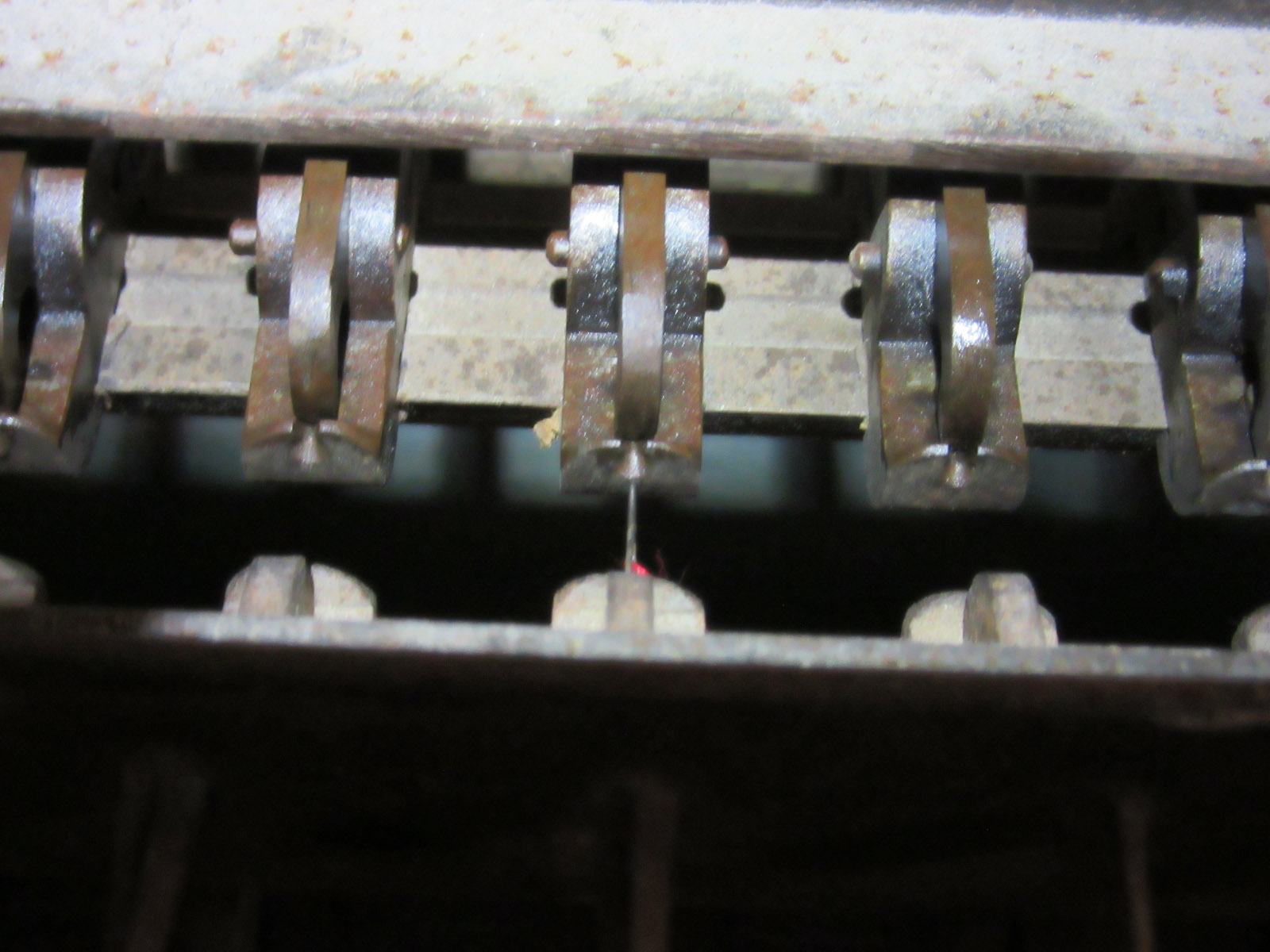 Tout est monté, à peu près réglé, il faut essayer.Il faut d’abord lubrifier intégralement la machine. Et c’est parti ! Je place une aiguillée (aiguille munie de son fil) sur une pince nettoyée et réglée, et quel moment d’émotion quand l’aiguille change de côté, passant d’un chariot de 400 kg à l’autre, délicatement passée d’une pince à l’autre.